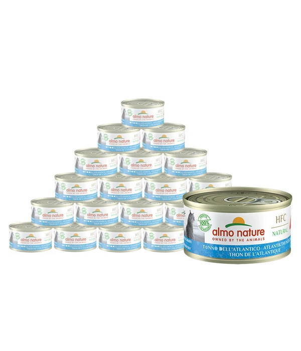 Mit almo nature Nassfutter HFC Natural Atlantikthunfisch bieten Sie Ihrer Katze kein gewöhnliches Nassfutter, denn bei dieser Nassnahrung werden nur hochwertige sowie natürliche Zutaten verarbeitet. Es überzeugt vor allem durch seinen Verzicht auf jegliche chemische Zusatzstoffe, wodurch der Geschmack des Futters einzigartig ist. Besonders durch den sehr hohen Fischanteil von 75 % erfreut sich almo nature HFC Natural Atlantikthunfisch über höchste Akzeptanz. Die im Ergänzungsfutter verwendeten HFC-Zutaten haben Lebensmittelqualität. Damit keinerlei wichtigen Nährstoffe verlieren gehen werden die Zutaten rein mechanisch verarbeitet, das Fleisch wird gekocht und geschnitten und das alles ohne chemische Behandlung. Die Konservierung von almo nature Nassfutter HFC Natural Atlantikthunfisch erfolgt in der eigenen Kochbrühe, so bleiben Nährstoffe sowie der einzigartige Fischgeschmack bestens erhalten. Dem leckeren Nassfutter kann Ihr Stubentiger nicht widerstehen. Die hochwertige Katzennahrung ist zudem glutenfrei, das Reis als Kohlenhydratquelle gewählt wurde und so ernährungssensible Katze ebenfalls in den Genuss von almo nature HFC Natural Atlantikthunfisch gelangen. Natürlich wurde das HFC Natural von almo nature so konzipiert, dass das Nassfutter auf die ernährungstypischen Bedürfnisse von Katzen angepasst ist. Mit diesem Futter verwöhnen Sie Ihren Liebling nach Strich und Faden.