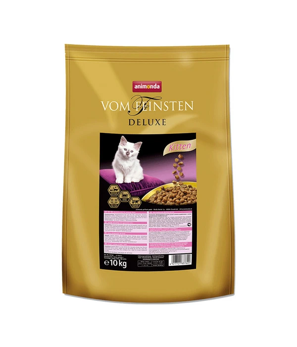 Kleine Kitten und junge Kätzchen brauchen für einen guten Start ins Leben und eine gesunde Entwicklung die richtige Ernährung. Das Katzentrockenfutter animonda VOM FEINSTEN Deluxe Kitten ist ein Katzenfutter aus dem Premium-Segment und liefert den kleinen Samtpfoten alles was sie zum Wachsen benötigen. Dieses Trockenfutter Katzen stärkt mit speziellen Vitamin-Wirkstoffkombinationen das Immunsystem der Kleinen und versorgt sie mit hochverdaulichen Eiweißen und Fructooligosacchariden (FOS) als Ballaststoffen, ideal für die noch empfindliche Verdauung. Und genau deshalb ist das hochwertige animonda VOM FEINSTEN Deluxe Kitten auch frei von Weizengluten, Soja, Farb- und Konservierungsstoffen sowie Antioxidantien.