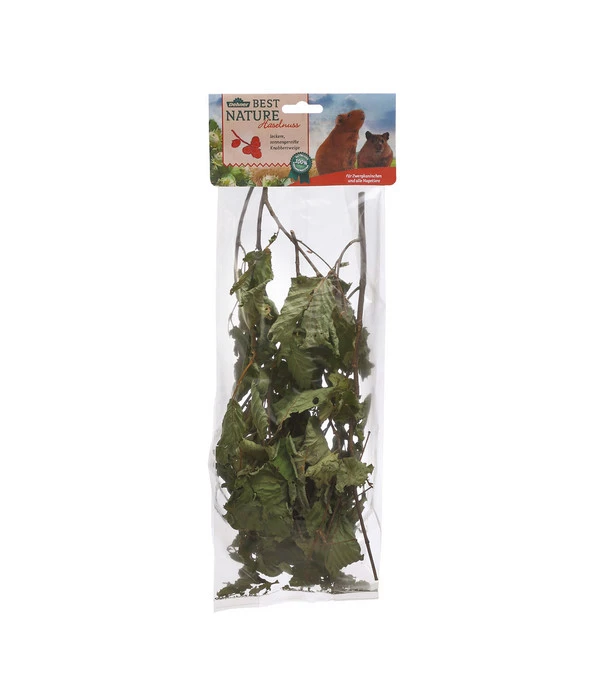 Im Kleintierheim ist es mit den Dehner Best Nature Haselnuss Knabberzweigen vorbei mit der Langeweile. Die köstlichen Haselnusszweige sind eine natürliche Nahrungsergänzung für Zwergkaninchen und alle Nagetiere. Die Haselnusssträußchen mit ihren sonnengereiften Zweigen und Blättern erhalten Sie in ihrer ursprünglichsten Form. Die natürlichen und leckeren Knabberzweige wurden schonend geerntet und getrocknet. Gönnen Sie Ihren Zwergkaninchen oder Nagetieren diesen besonderen Snack und sorgen so für Beschäftigung und Abwechslung im Kleintierheim wie in der freien Natur. Begeistert werden sie mit dem Zerlegen und Knabbern der Haselnusszweige beschäftigt sein und zugleich wird der so wichtige Zahnabrieb bei Ihrem Liebling unterstützt. Die Dehner Best Nature Haselnuss ist 100 % Natur und ein gesundes und leckeres Ergänzungsfutter oder Knabbersnack. Mit diesem natürlichen Knabberzweigen Dehner Best Nature Haselnuss bieten Sie allen Nagetieren oder Zwergkaninchen eine leckere und gesunde Abwechslung für eine artgerechte Tierhaltung. Legen Sie die Knabberzweige Haselnuss von Dehner Best Nature einfach im Kleintierheim aus und schon können sich Ihre Lieblinge ausgiebig damit beschäftigen.