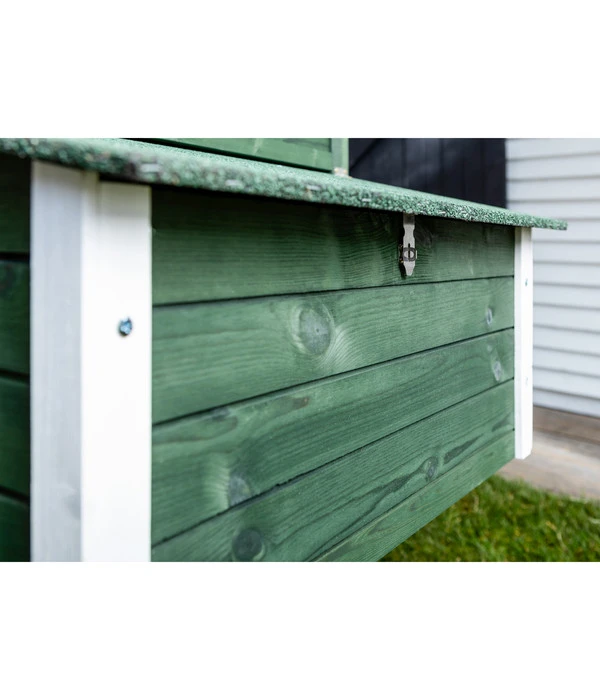 Mit dem Dehner Hühnerstall Happy Farm Happy Hen bekommen Sie einen Hingucker für Ihren Garten und Ihre Hühner ein gemütliches Zuhause. Zur Nachtruhe und als geschützter Aufenthaltsort ist der Hühnerstall mit zwei Sitzstangen bestens geeignet. Vom Boden dringt keine Kälte und Nässe in den Hühnerstall, da dieser erhöht angebracht ist. Im verriegelbaren Legekasten mit zwei Fächern und aufklappbarem Dach können die Hühner bei Bedarf ihre Eier ablegen. Über den außen angebrachten Griff können Sie die Freigangluke vom Stall je nach Bedarf öffnen oder schließen. Über die Hühnerleiter gelangen Ihre Stallbewohner in den Außenbereich oder wieder zurück in den Hühnerstall. Um genügend Auslauf zu erhalten, sollten Sie Ihren Hühnern täglich Freigang auf der Wiese oder einem zusätzlichen Freilaufgehege geben. Bei schlechtem Wetter können sich Ihre Hühner z.B. in dem überdachten Außenreich zurückziehen und frei bewegen, denn der Auslauf ist rundum mit einem Drahtgewebe ausgestattet, um Feinde wie Marder, Katzen und Greifvögel etc. draußen zu halten. Der Hühnerstall Happy Hen verfügt über eine herausziehbare und leicht zu säubernde Kot-Schublade mit verzinkter Wanne. Über verschiedene verschließbare Eingänge zum Stallbereich und Außenbereich erhalten Sie weitere Zugangsmöglichkeiten, um Ihre Tiere zu versorgen oder den Hühnerstall zu reinigen. Denn ein leichtes Sauberhalten ist wichtig für die Stallhygiene und Gesundheit Ihrer Hühner. Ein optimaler Platz für diesen Hühnerstall mit überdachtem Bereich ist eine trockene Stelle in windgeschützter Lage, denn Staunässe und direkte Sonneneinstrahlung stören das Wohlbefinden. Die Lieferung erfolgt zerlegt zum Selbstaufbau.