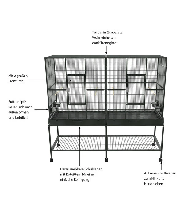Sie haben nicht nur einen Vogel, sondern gleich zwei, drei oder mehr? Dann sollten Sie den geselligen Piepmätzen auch das passende Heim zur Verfügung stellen. Denn Ihre gefiederten Freunde brauchen neben Artgenossen, abwechslungsreichem Spielzeug und der täglichen Möglichkeit zum Freiflug auch ein Zuhause, das viel Platz bietet. Ideal für kleine Ziervögel wie Sittiche und Schwarzohrpapageien ist da die Dehner Voliere Aurelio. Der geräumige Doppel-Vogelkäfig aus pulverbeschichtetem Metalldraht und Metallröhren steht auf einem praktischen Rollwagen zum Hin- und Herschieben und kann bei Bedarf mit einem Trenngitter in zwei Einzelvolieren verwandelt werden. Herausziehbare Kotgitter machen die Reinigung zum Kinderspiel.