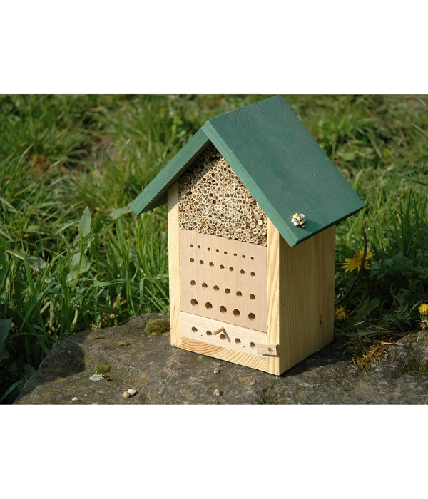 Das dobar Insektenhotel besteht aus naturbelassenem Kiefernholz, auch die Schilfrohrstängel sind unbehandelt. Das hübsche Spitzdach ist mit Holzleisten eingedeckt. Sie können diese Nisthilfe aufhängen, aber auch aufstellen, idealerweise an einen geschützten, sonnigen bis halbschattigen Platz, der von der Wetterseite abgewandt ist.