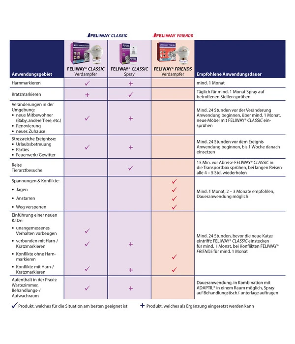 Der FELIWAY® Classic Nachfüllflakon ist ausgelegt für den FELIWAY® Classic Verdampfer. Dieser muss kontinuierlich über die gesamte Anwendungsdauer eingesteckt bleiben. Ein Nachfüllflakon (48ml) reicht für bis zu 30 Tage. Er deckt eine Wohnfläche von bis zu 70 m2 ab. Damit der Verdampfer optimal arbeiten kann, sollte er nicht unter einem Regal, hinter Türen, Vorhängen, Möbeln oder in der Nähe der Katzentoilette angebracht werden. Der Steckdosen-Verdampfer sollte monatlich überprüft und für optimale Ergebnisse nach 6 Monaten Anwendung erneuert werden.