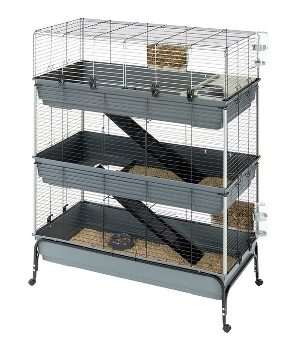 Als Halter profitieren Sie ebenfalls von den Vorzügen dieses modernen Nagerheims, denn die Reinigung gestaltet sich dank der durch Haken trennbaren Böden und Gitter kinderleicht. Auch die Sicherheit Ihrer Tiere ist selbstverständlich gewährleistet. Die einzelnen Ebenen sind durch Leitern sowie Seitensäulen verbunden und mit speziellen Verschlussklammern gesichert, sodass Sie sich um die Stabilität der Konstruktion keine Sorgen machen müssen. Die Lieferung Ihres ferplast Nagerheims Rabbit 120 Tris erfolgt inklusive umfangreichem Zubehör wie Heuraufen, Trinkflaschen und vielem mehr. Greifen Sie jetzt zu und freuen Sie sich auf zufriedene Nager!
