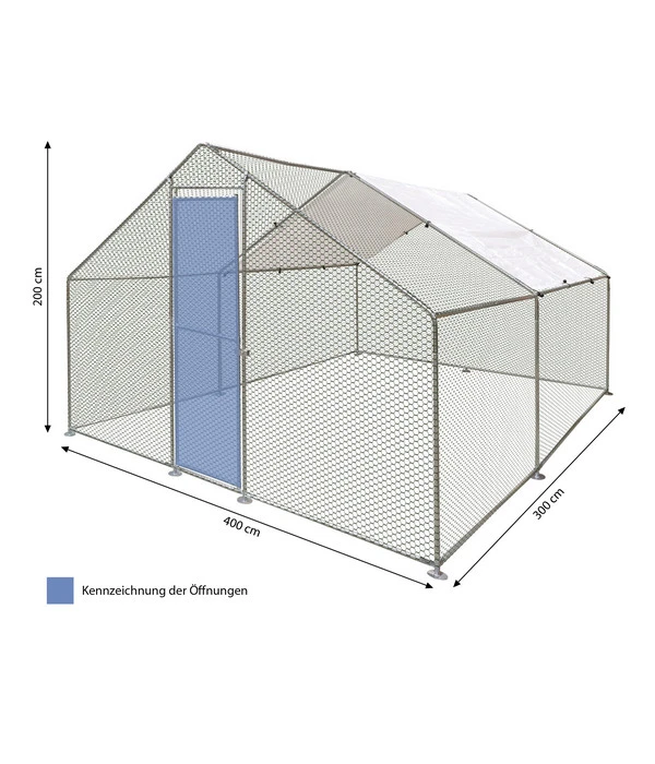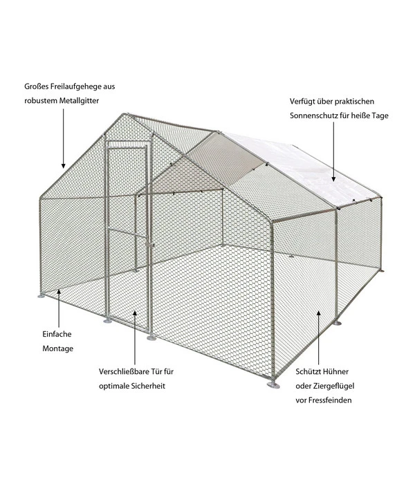 Haben Sie Hühner oder Ziergeflügel, denen Sie ein hübsches, angenehmes und sicheres Zuhause bieten möchten? Sind Sie stolzer Besitzer eines Papageis oder von Wellensittichen? Wenn Ihre Tiere ausreichend Platz haben sollen, dann eignet sich das Freilaufgehege Doerak der Marke Flamingo ideal! Am besten bestellen Sie zusammen mit dem Gehege einen geräumigen Stall, in dem sich Ihre Hühner zurückziehen können. Sofern Sie ihnen zudem ausreichend Trinkwasser und Futter zur Verfügung stellen, fühlen sich die Hühner pudelwohl. Bestimmt danken sie es Ihnen, indem sie bald noch schönere, größere Eier legen. Damit es Ihren gefiederten Freunden während der nächsten Hitzeperiode nicht zu heiß wird, verfügt das Gehege noch über einen praktischen Sonnenschutz. Auch bei Regen spendet das Tuch Schutz. Um für die Sicherheit Ihres Geflügels zu sorgen, können Sie das Vogelheim bequem abschließen.
