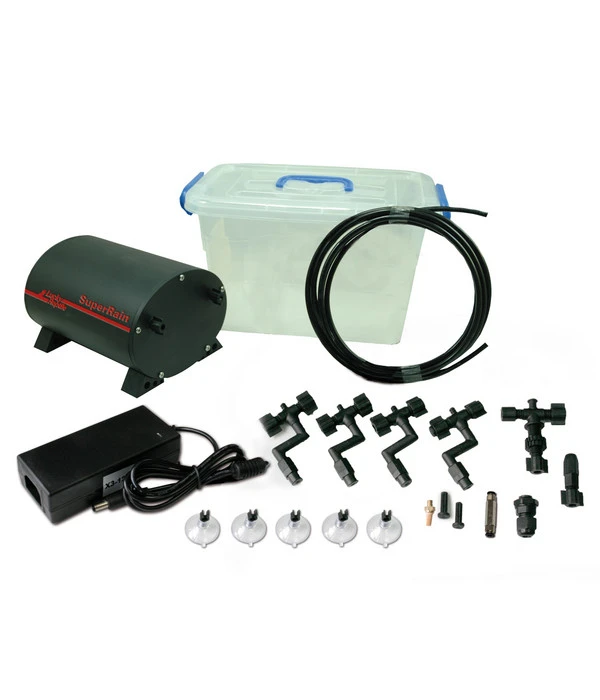 Für ein natürliches, gesundes Regenwaldklima in Ihrem Terrarium ist eine hochfunktionelle Beregnungsanlage unerlässlich. Ganz sicher eine der besten ist die Lucky Reptile Super Rain II Beregnungsanlage, die jetzt noch besser geworden ist. Bereits das Vorgängermodell dieser Lucky Reptile Beregnungsanlage war aus vielen guten Gründen sogar für sehr große Terrarien sehr beliebt. Nun bringt es die Weiterentwicklung der Lucky Reptile Super Rain II Beregnungsanlage auf eine sehr beachtliche Förderleistung von bis zu 162 Litern pro Stunde, wohlgemerkt bei einem Druck von 4,8 bar.