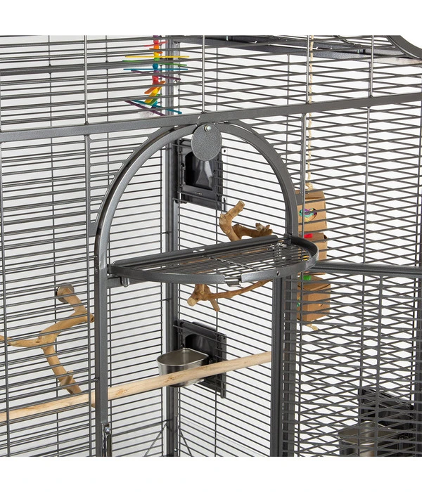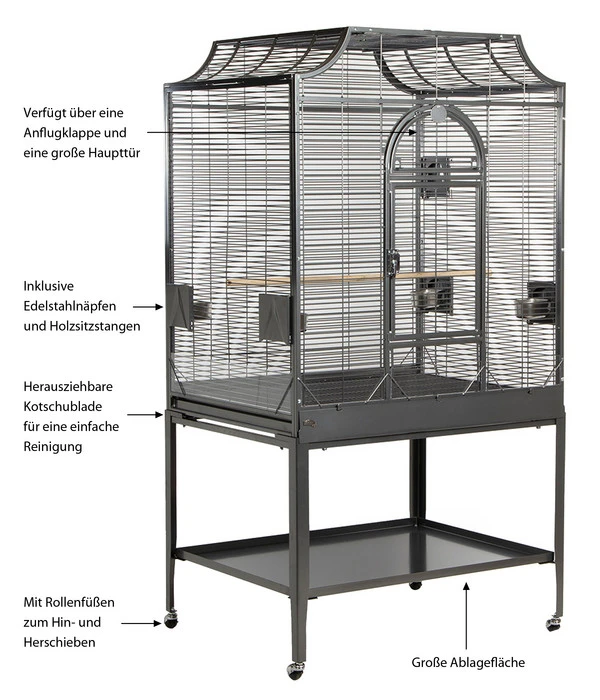 Auch Vögel mögen ein schickes Zuhause haben. Mit der Vogelvoliere Madeira III Antik erhalten Sie einen besonders edlen Vogelkäfig, der Ihren gefiederten Lieblingen zudem noch besonders viel Platz bietet. Er besteht aus schwermetallfreiem Stahl, überzogen mit einer Avilon Pulverbeschichtung, welche speziell für die Vogel- & Nagerhaltung ausgelegt ist. Die Vogelvoliere Madeira III Antik überzeugt vor allem durch ihre filigrane, waagrechte Verdrahtung. Die Vogelvoliere Madeira III Antik eignet sich optimal als Grund- bzw. Erstausstattung, da Sie viele nützliche Extras dazu erhalten. Neben den vier Außentüren und einer Zusatztür, welche zur Anbringung eines Nistkastens oder Badehauses geeignet sind, bekommen Sie vier Edelstahlnäpchen und zum Spritzschutz Klarsicht-Acrylscheiben. Der supergroße Vogelkäfig verfügt zudem über eine kleine Anflugklappe oberhalb der großzügigen Haupttür, welche die perfekte Ausstattung komplett macht. Aber auch die Reinigung der Vogelvoliere sollte man ansprechen, da diese mehr als kinderleicht fällt. Dank eines Kotgitters sowie Schublade, die zudem über eine Metallklappe gesichert werden, können Sie den Käfig schnell und einfach säubern und Ihren gefiederten Lieblingen ein prächtiges Zuhause bieten. Für eine leichtere Positionierung verfügt die Voliere über einem Rollwagen inkl. Ablage, sodass Sie diese einfach von A nach B rollen können. Einfach und schöner geht es einfach nicht.