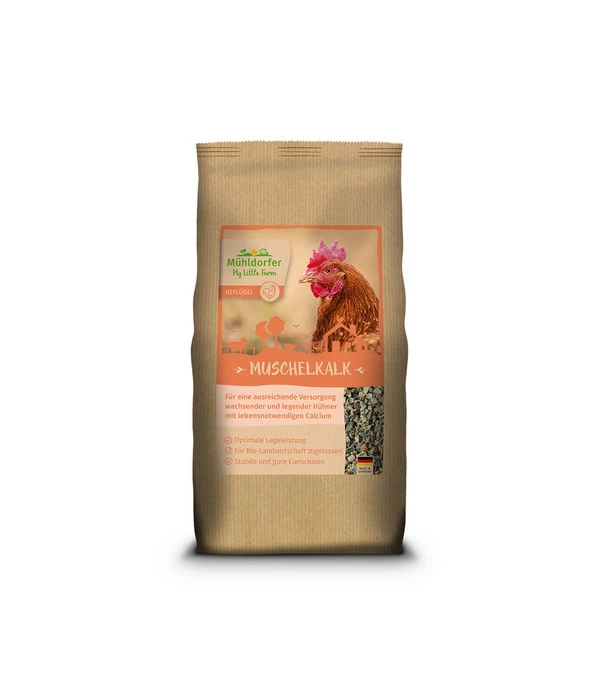 Um eine optimale Eierschalenqualität, besonders bei älteren Tieren zu gewährleisten, brauchen Ihre Hühner Muschelkalk. Denn nichts anderes versorgt Ihre Hühner auf natürliche Weise mit genügend lebensnotwendigem Calcium. Mit dem Ergänzungsfutter My Little Farm Muschelkalk können Sie Mangelerscheinungen und schlechten Legeleistungen vorbeugen oder diese sogar ganz vermeiden. Denn Muschelkalk ist ein für Hühner überaus wichtiger Mineralstoff, der die kontinuierlich gute Legeleistung fördern und für eine erstklassige Eischalenqualität bis zum Ende einer Legeperiode sorgen kann. Zumal der My Little Farm Muschelkalk vom Organismus Ihrer Tiere ausgesprochen gut verwertet wird. Denn das darin enthaltene Calcium ist vollständig verdaulich, was wichtig ist, damit der Mineralstoff zum stabilen Knochengerüst Ihres Geflügels – besonders in der Wachstumsphase – beitragen kann. Und selbstverständlich ist auch der My Little Farm Muschelkalk in der Bio-Landwirtschaft erlaubt – am besten jeden Tag und zur freien Verfügung.