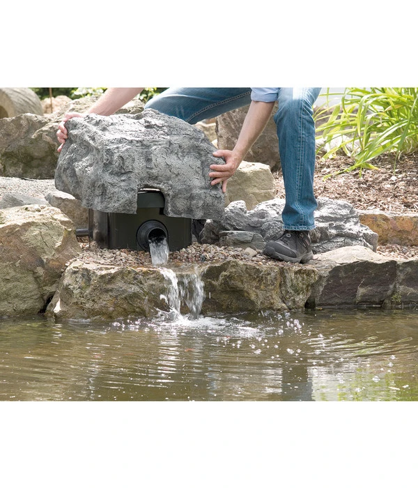 Die Dekorfelsabdeckung ermöglicht Ihnen im Gegensatz zu selbst gebastelten Abdeckungen einen schnellen und bequemen Zugang zu Ihrem Teichfilter. Steht eine Wartung oder eine Reinigung des Filters an, können Sie die Abdeckung mit einem Handgriff entfernen und erhalten so Zugang zur Technik. Nach erfolgter Wartung kann der Spritzwasserschutz dann wieder über dem Teichfilter platziert werden. Somit entfallen aufwändige Arbeiten zum Freilegen des Filters und eine anschließende Rekonstruktion der Abdeckung.