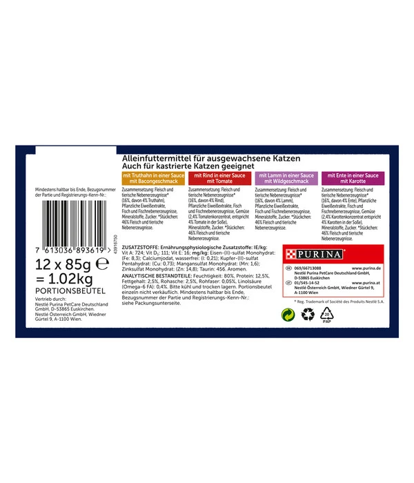 In PURINA felix® Sensations Saucen Geschmacksvielfalt vom Land Katzen Nassfutter sind selbstverständlich die Vitamine A, D und E enthalten, ebenso wie wertvolle Mineralien wie Eisen und Calcium. Ebenfalls im schmackhaften Katzenfutter enthalten sind die Aminosäure Taurin, die Ihre Katze für Augen, Herz und den Fettstoffwechsel benötigt, wie die Omega-6-Fettsäuren, die für eine gesunde Haut und ein schönes Fell Ihres Lieblings sorgen.