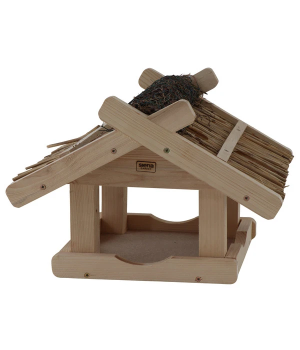 Mit dem liebevoll designten Siena Garden Vogelhaus Steinkauz sorgen Sie, dank des attraktiv mit vernetzter Heide gestalteten Dachfirsts, für eine gemütliche Atmosphäre in Ihrem Grünbereich. Das aus FSC-zertifiziertem Kiefernholz gefertigte Häuschen wurde für die lange Werterhaltung mit einer Holzbeize auf Naturbasis behandelt. Im Inneren bietet das naturbelassene Vogelhaus Steinkauz seinen Besuchern eine großzügige Fläche, auf der Sie Sonnenblumenkerne, Futterrosinen, Erdnussbruch oder andere Köstlichkeiten für hungrige Schnäbel anrichten können. Hier, unter dem großen, mit Reet gedecktem Dach, sind die gefiederten Sangeskünstler aller Art vor Regen oder Schnee in Sicherheit und fühlen sich sofort heimisch, wenn sie zu Gast sind, um die dargebotenen Leckereien zu schmausen.