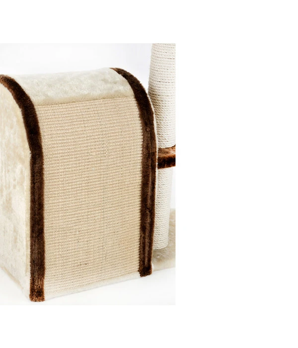 Gleich unten am Kratzbaum befindet sich die geräumige Wohnhöhle, die ein schöner Ort ist, an dem sich Ihre Katze zurückziehen und verstecken kann. Die Höhle hat eine große Öffnung unten und eine kleine im oberen Giebel und bietet Ihrer Katze viel Platz zum Ausruhen. Die Rückseite der Wohnhöhle ist komplett mit Sisal bespannt und bietet Ihrer Katze so eine großzügige Kratzfläche. Die obere kleinere Öffnung in der Höhle verbindet den Kratzbaum mit der Liegefläche auf der ersten Etage. An dieser halbrunden Liegeplatte ist eine Spielkugel an einem Gummiband befestigt, die für noch mehr Unterhaltung Ihrer Katze sorgt. Ganz oben am Kratzbaum gibt es eine kuschelige Liegemulde mit Lehne, die Ihrer Katze einen idealen Beobachtungsplatz bietet. Für den notwendigen Komfort und ein tolles Kuschelfeeling sind alle Liegeflächen an diesem Kratzbaum sowie die Wohnhöhle mit hochwertigem Plüsch versehen. Für noch mehr Kratzfläche sind die Holme mit Sisal umwickelt und unterstützen damit die Krallenpflege Ihrer Katze. Durch die große Bodenplatte erhält der Kratzbaum Winnie die nötige Standfestigkeit und dank seiner kompakten Größe findet er überall seinen Platz.