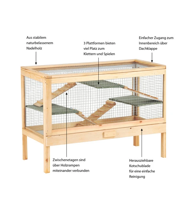 Im Inneren der Silvio Design Nagervoliere Joe erwartet Ihre vierbeinigen Lieblinge eine durchdachte Inneneinrichtung in Form von drei Plattformen, die sicher immer wieder gern frequentierte werden. Diese Zwischenetagen sind über Holzrampen miteinander verbunden, so dass Ihre Nagetieren täglich viel Bewegung und gleichzeitig jede Menge Rauf- und Runter-Laufspaß haben.