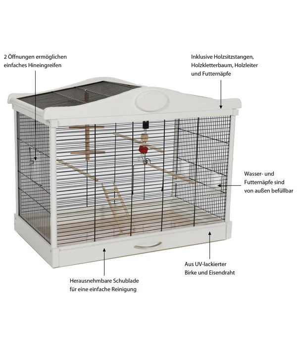 Ein Vogelkäfig, der ideal für Vögel wie Wellensittiche, Kanarien und Exoten ist. Der 75/58/43 cm (B/H/T) große Skyline Vogelkäfig Lena ist aus einem stabilen Rahmen aus gebeiztem und UV-lackiertem Birkenholz gefertigt und wird mit einer umfangreichen Grundausstattung geliefert. Darin enthalten sind Holzsitzstangen, ein kleiner Holzkletterbaum sowie eine Holzleiter und zwei von außen befüllbare Futternäpfe aus Kunststoff. Zur Unterhaltung Ihrer Vögel ist noch ein buntes Holzspielzeug mit dabei. Zudem verfügt der Vogelkäfig Lena von Skyline über zwei Öffnungen, die Ihnen ein einfaches Hineingreifen ermöglichen. Um Ihnen die Reinigung zu vereinfachen, verfügt der Käfig außerdem über eine herausnehmbare Vogelsand-Schublade. Bei diesem Käfig für Vögel beträgt der Drahtabstand der Gitterstäbe aus pulverbeschichtetem Eisendraht 11 mm und die Drahtstärke 1,6 bzw. 3,2 mm.