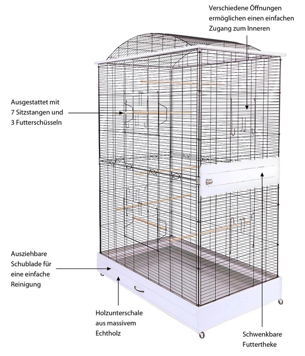 Wenn Ihnen Ihre gefiederten Freunde am Herzen liegen, schaffen Sie ihnen mit dem Skyline Vogelkäfig Loretto XXL das perfekte Zuhause. Diese Voliere bietet ausreichend Platz auf verschiedenen Ebenen, um Ihren Lieblingen Möglichkeit zur Bewegung, aber auch zum Ausruhen zu geben. Darüber hinaus lädt die schwenkbare Futtertheke, die mit Edelstahlnäpfen ausgestattet ist, zum Körner picken oder Wasser trinken ein. Beim Loretto XXL kommen aber auch Ihre eigenen Wünsche nicht zu kurz. Mit seinem nostalgisch anmutenden Stil, ist dieser Vogelkäfig ein wunderschöner Blickfang in jedem Raum. Vier stabile Rollen ermöglichen schnelle Standortwechsel und an warmen Tagen den Aufenthalt auf der Terrasse oder dem Balkon.