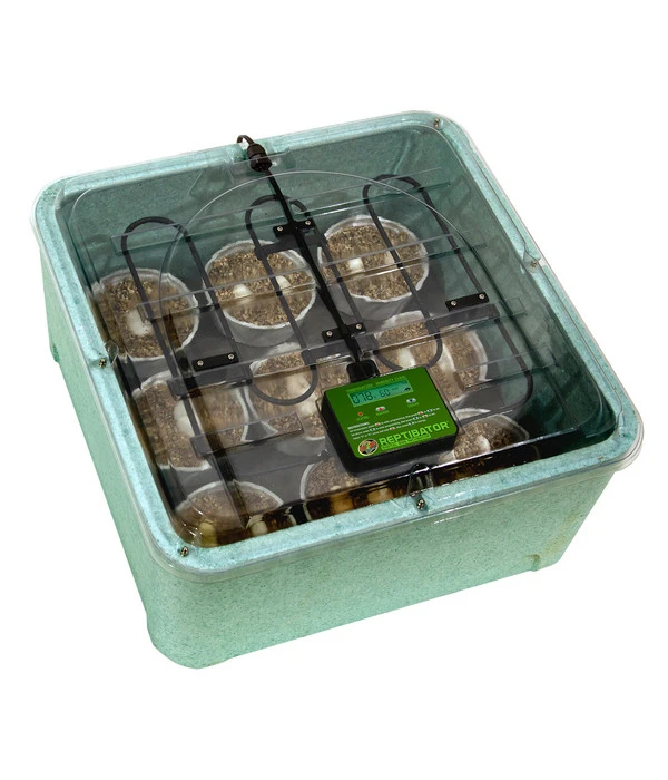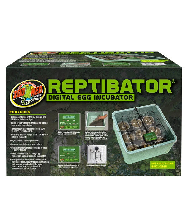 Der Zoo Med ReptiBator ist ein digitaler Inkubator, der sich vor allem sehr gut zum Heranzüchten von Ameisen als auch Reptilieneiern eignet. Der Zoo Med ReptiBator wird digital mit einem LCD-Display und einer LED Wärmeanzeige gesteuert und verfügt über ein Pulse Proportional-Thermostat, mit einstellbarem Alarm, für eine sichere und präzise Temperaturregelung. Sobald der Inkubator die eingestellte Temperatur erreicht, leuchtet gelegentlich die LED-Wärmeanzeige auf, wenn die Heizung kurze Stromimpulse zur Aufrechterhaltung der korrekten Temperatur erhält. Dies beugt Schwankungen zwischen hohen und niedrigen Temperaturen vor und spart außerdem Energie. Der Temperaturbereich liegt zwischen 15° C und 40° C und die Luftfeuchtigkeitsanzeige liegt zwischen 10 % und 95 % relativer Luftfeuchte. Mithilfe der Luftfeuchtigkeitsanzeige kann diese kontrolliert, aber nicht automatisch gesteuert werden. Der eingebaute Speicher sichert alle Einstellungen, falls ein Stromausfall eintritt. Durch die transparente Abdeckung können die Eier ohne das Öffnen des Inkubators ohne weiteres beobachtet werden. Durch im Boden eingelassene Wassernischen erhält der ReptiBator einen Wasserspeicher. Eine korrekte Luftfeuchte und eine gleichmäßige Verdunstung im Brutkasten ermöglichen somit der Schwammspeicher und die Kontinuierliche Ventilation. Der Inkubator ist ausgestattet mit einem Heizelement, das einen Stromverbrauch von nur 55 Watt aufweist. Der Zoo Med ReptiBator besteht aus Styropor, deshalb sollten keine schweren Gegenstände darauf abgestellt werden. Dieser Inkubator bieten Ihnen eine einfache und sichere Möglichkeit Reptilieneier heranzuzüchten.